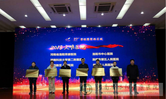 河南省洛阳荣康医院、市中心医院、河南科技大学第二附属医院、市第五人民医院、市新区医院、偃师市人民医院、孟津县公疗医院、新安县中医院、嵩县人民医院、嵩县中医院、栾川县人民医院、栾川县中医院等12家医疗机构获得“2018洛阳文明医院”荣誉称号。市卫生健康委员会调研员谢春秋宣读表彰文件,他说,2018年,全市医疗机构着眼提供全方位全周期健康服务,积极推进健康洛阳建设,加快建设覆盖城乡、公平可及的基本医疗和公共卫生体系,积极解决好“看病难、看病贵”等问题,经过主流媒体的宣传,引起了社会各界的广泛赞誉,涌现了一大批市民满意的文明医疗机构。根据2018洛阳“文明医院”宣传活动执委会工作计划,经认真硏究,推选出了2018洛阳“文明医院”获奖单位,希望受表彰的医院继续努力,为健康洛阳建设奉献新的力量!办公室主任张天伟代表我院登台领奖。