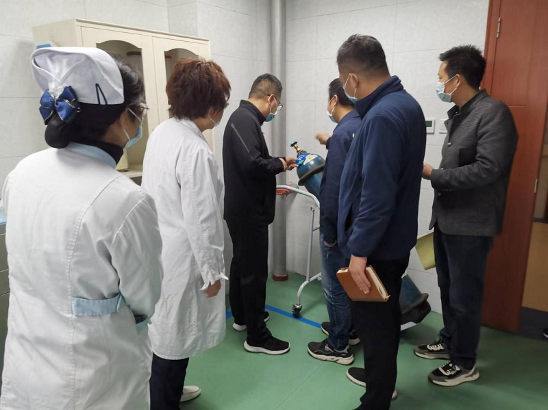 检查小组首先到病区对氧气使用管理情况和消防设施器材进行细致检查,查看使用记录、消防专用防静电扳手,重点强调了氧气瓶使用规范、固定方法等注意事项,同时询问在岗职工消防安全知识。重点检查了消防中心监控室、锅炉房、污水站、配电房基础设施运行、使用及维护情况。查看值班巡查记录,询问工作人员相关操作安全注意事项、消防应急处置程序。最后,检查食堂燃气使用情况,测试燃气防漏报警装置灵敏度并对食堂操作间环境清洁、通风消毒等管理措施提出相关要求。