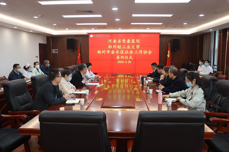 为实现医务社工专项领域理论、人才、资源的共享与互动,推动医院精神健康社会工作高质量发展,3月20日,我院与郑州轻工业大学政法学院、郑州市金水区社会工作协会签订实习及合作协议。郑州市金水区社会工作协会会长闻英,郑州轻工业大学政法学院副院长、副教授栗志强,院党委书记、院长尤东坡,党委副书记、副院长宋建军,副院长陈四军及相关科室负责人参加会议,签约仪式由陈四军主持。