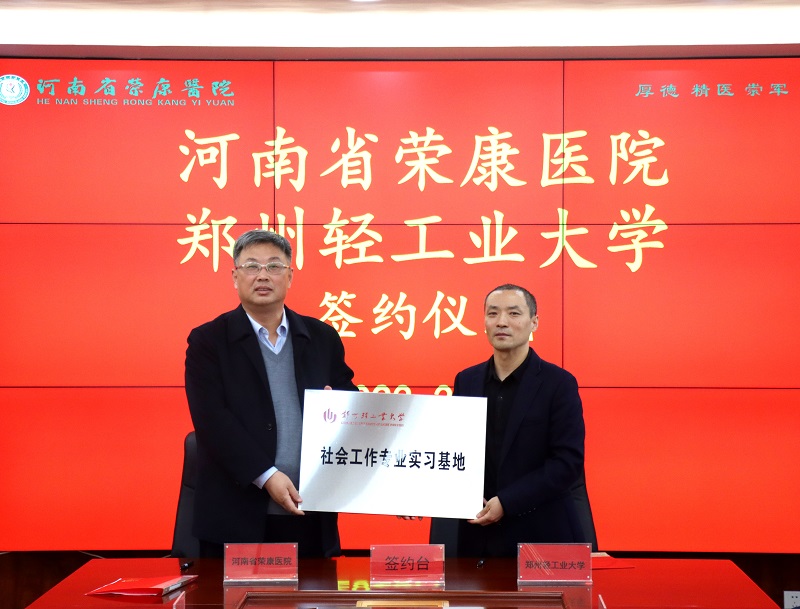 仪式上,康复科汇报了近几年来医院康复及社工工作的开展情况。尤东坡代表我院与郑州轻工业大学政法学院、郑州市金水区社会工作协会分别签订了硕士研究生及本科生社会工作实习基地协议及社会工作服务合作框架协议。尤东坡与栗志强共同为我院郑州轻工业大学社会工作专业实习基地揭牌。