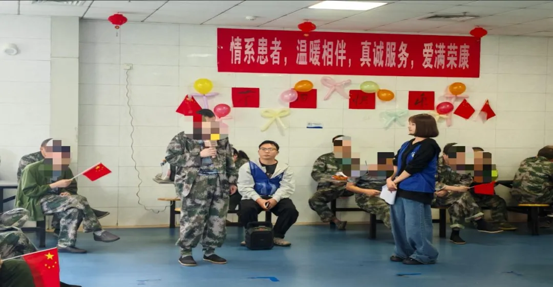 诗朗诵《我的祖国》声音洪亮,情感饱满,字字句句都蕴含着对祖国真挚的情感。在 “ 金曲时光机 ” 环节,患者积极参加,《没有共产党就没有新中国》《水手》《大海》等歌曲,他们唱出了军人的坚韧与辽阔,赢得了大家的阵阵掌声。