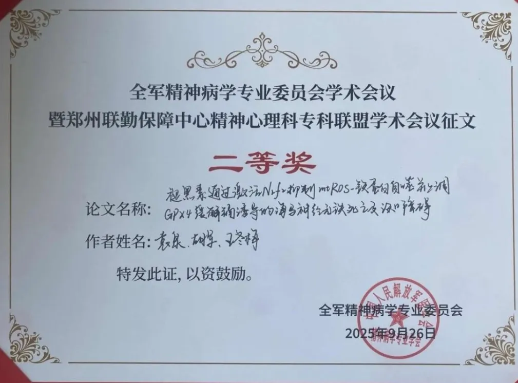此次我院学术团队在全军级精神病学会议上的出色表现,是医院长期坚持“科教兴院”、鼓励临床与科研紧密结合战略的成果体现。它标志着我院在精神神经科学的基础研究领域迈上了新的台阶。未来,我院将继续为青年人才搭建成长平台,持续推动学科高质量发展,为军地精神心理卫生事业贡献力量!