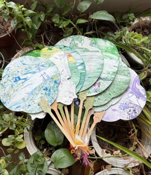 分享环节里,每一把漆扇都承载着独特的心声:“牡丹” 留白如月光般静谧,“紫菱”清新透着灵动,“莲花”黄绿交融似荷塘夕照,而最令人动容的,是那把写着“茉莉”的漆扇。它的主人轻声分享:“今天医生调了药,头很晕,但我期待这个活动很久了,还是坚持来了,不过还好来了,不然就错过这么有趣的体验。”蓝色与紫色在扇面温柔交织,恰如她不肯缺席生活的倔强。社工始终默默关注每位患者的状态,及时提供协助与鼓励,也让艺术疗愈的专业力量,在色彩流转中悄然绽放。