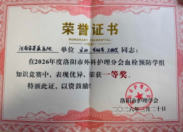 3月20日,在洛阳市护理学会主办、洛阳市中心医院承办的2026年外科护理分会年会上,血栓预防学组知识竞赛作为重要环节成功举办。来自全市24家医疗机构的72名选手同台竞技,展开了一场专业与智慧并重的精彩角逐。经过激烈比拼,河南省荣康医院代表队凭借出色发挥,荣获团体一等奖。