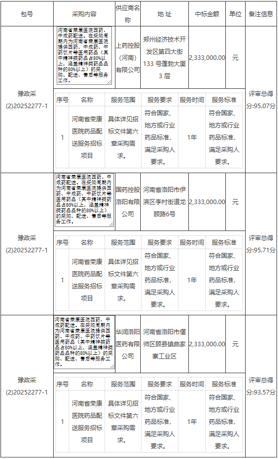 1.采购内容:本项目共分1个包。河南省荣康医院西药、中成药配送。在采购周期内为河南省荣康医院提供西药、中成药、中药饮片等医用药品(其中精神类药品占80%以上,涵盖精神类药品品种的80%以上)的采购、配送、售后等服务工作。相关符合要求的配送公司需三家。(中标数量3家)。具体详见招标文件第六章采购需求。